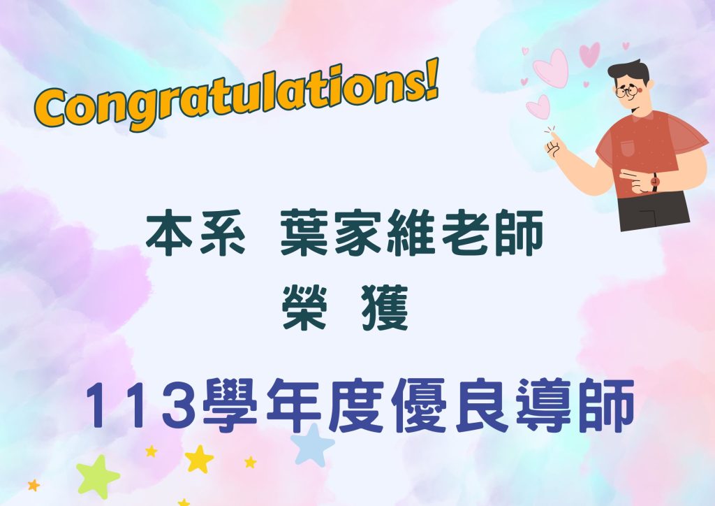 恭賀!本系葉家維老師榮獲「113學年度優良導師」,本系與有榮焉!