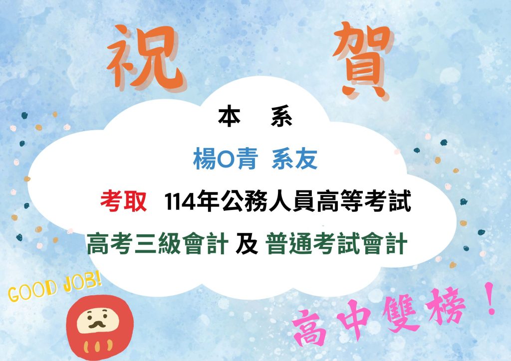 恭賀!本系 楊O青 系友 考取114年公務人員高等考試