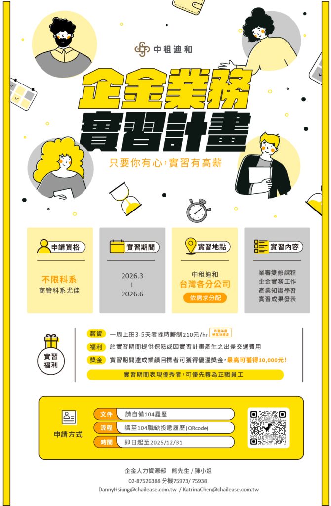 近期即將展開2026年中租迪和企金業務實習計畫招募活動,參與實習計畫的學生將會被分派至各業務單位,實際執行企金業務基礎工作!